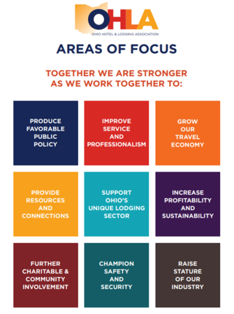 The Ohio Hotel & Lodging Association will be a collaborative and positive force working for Ohio's travel economy. We will earn our members through proactive leadership, integrity, teamwork, and customer service.